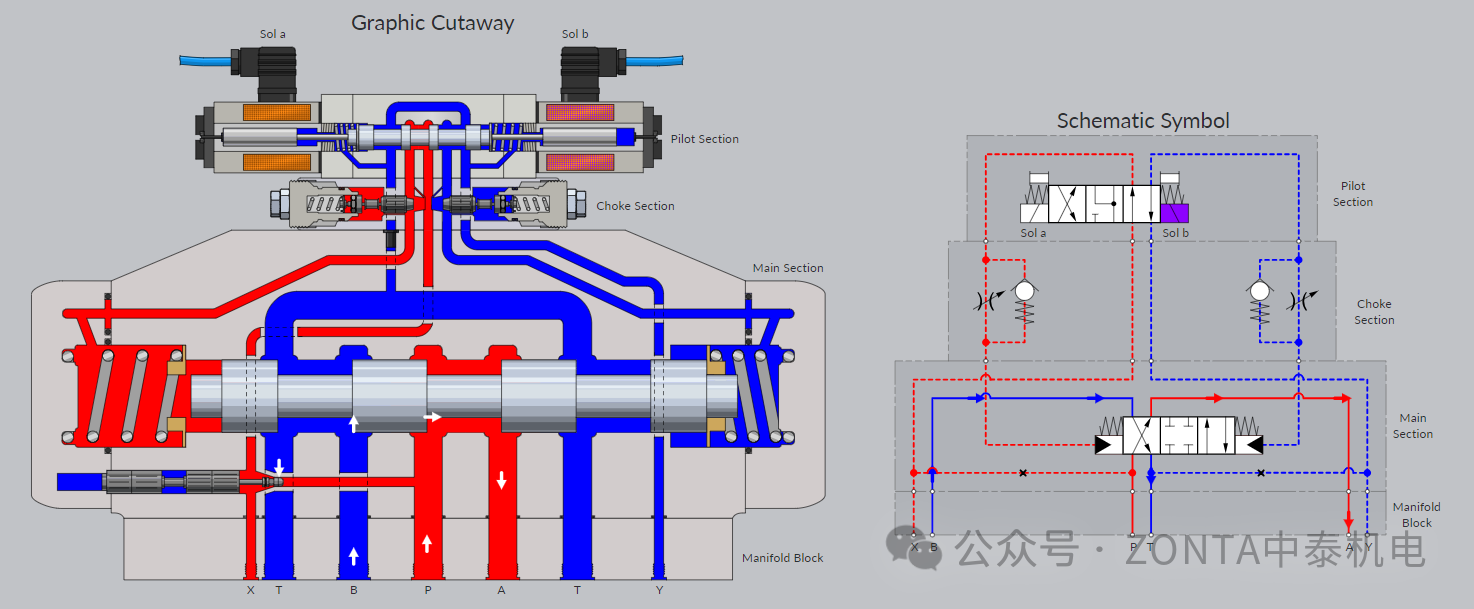 電磁鐵A得電,內(nèi)控內(nèi)排,進口節(jié)流