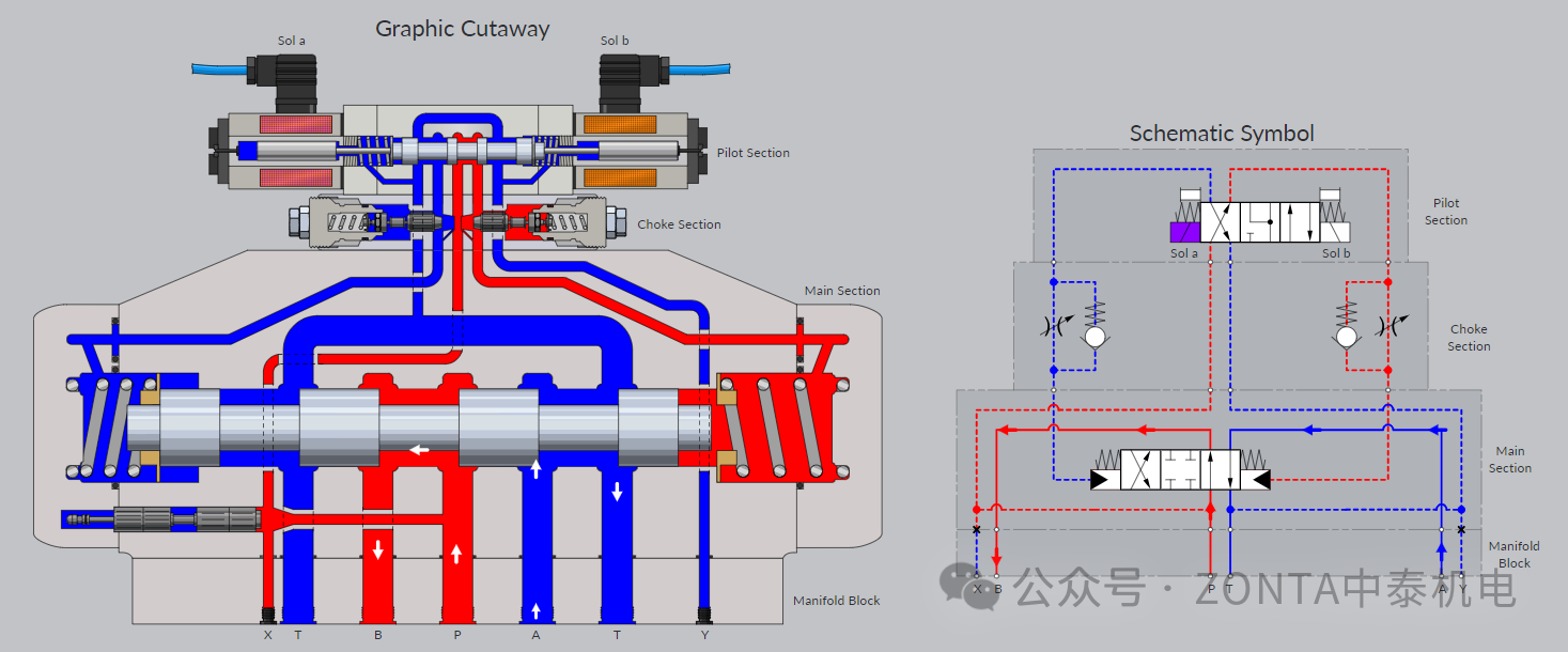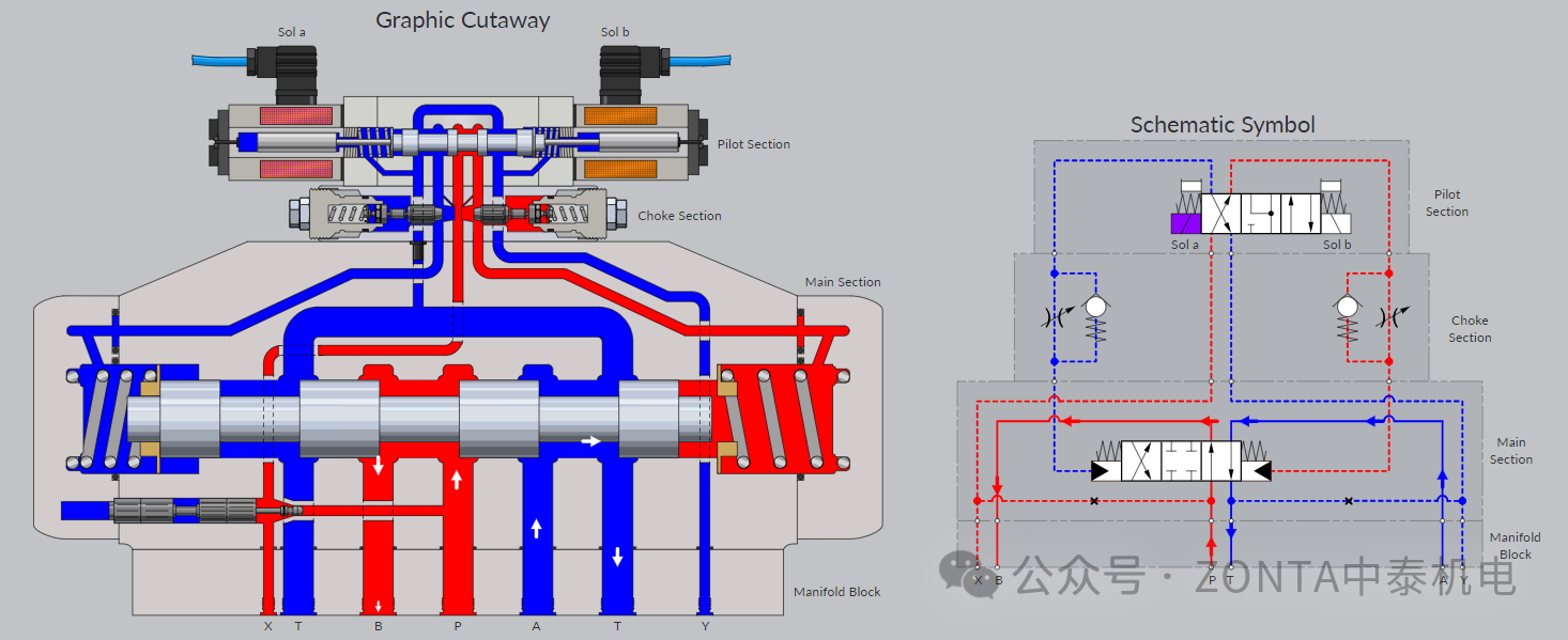 E型中位機能換向閥電磁鐵得電時的閥芯動作
