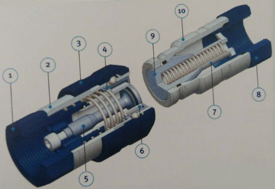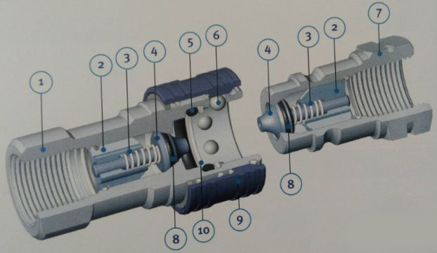 ①-閥座②-插座本體③-套筒④-閥⑤閥芯 ⑥-活塞 ⑦-閥座 ⑧-接頭 ⑨-閥芯 ⑩-插頭本體