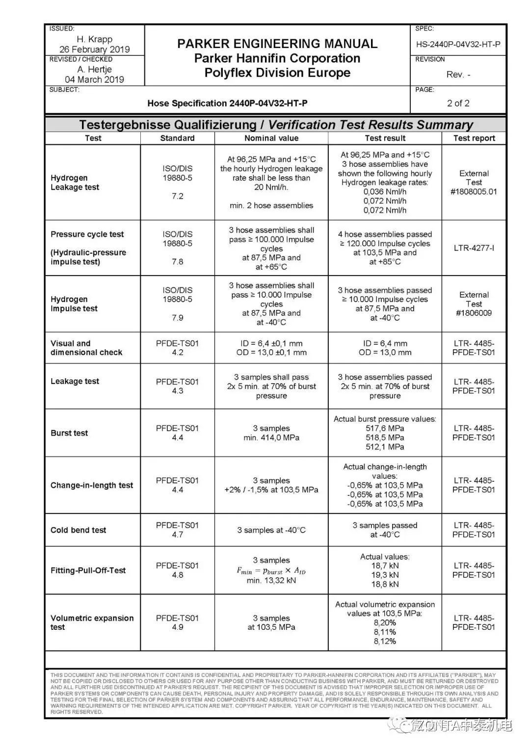 派克2440P-04V32-HT-P氫氣軟管工作壓力高達(dá)875bar,符合ISO-19880-5 要求,可在-40℃的低溫環(huán)境下實(shí)現(xiàn)快速加氫。該軟管具有很高的耐磨性、很好的耐臭氧能力、很強(qiáng)的抗紫外線(xiàn)能力、壽命周期長(zhǎng),適合于戶(hù)外安裝應(yīng)用。另外其小彎曲半徑的特點(diǎn)使其可應(yīng)用于狹小的安裝空間。最后,該軟管不但能有效降低氫氣滲透,還能顯著提升氫氣系統(tǒng)運(yùn)行的安全,是氫能源系統(tǒng)的理想選擇。