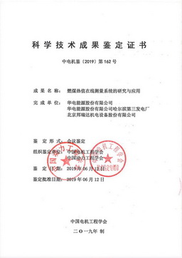 2019年6月12日,中國電機工程學會與中國動力工程學會聯合召開了該產品的項目鑒定會,鑒定委員會認為:項目研發的新型燃煤熱值在線測量系統,具備成本低、安全性高、運行可靠的特點,解決了火電廠燃煤熱值在線檢測的難題,為火電廠鍋爐燃燒控制和精細化管理提供了技術支撐,具有顯著的經濟、社會效益和推廣應用前景,居國際先進水平。