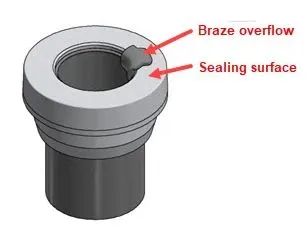 釬焊是一項復(fù)雜的操作,可能會導(dǎo)致密封面上出現(xiàn)焊渣溢流。由于密封面被破壞,就可能造成鋼管螺母處的泄漏。焊條熔化時產(chǎn)生的熱量使密封面位置可能產(chǎn)生焊渣溢流,焊條融化液會流向更高溫度的地方。一旦發(fā)生融化液溢流,應(yīng)立即轉(zhuǎn)移到襯套的小直徑端進行焊接,使融化液均勻流過接頭。如果發(fā)現(xiàn)釬焊溢流,裝配前請取下受影響的襯套,然后在該位置處重新釬焊一個新的襯套。