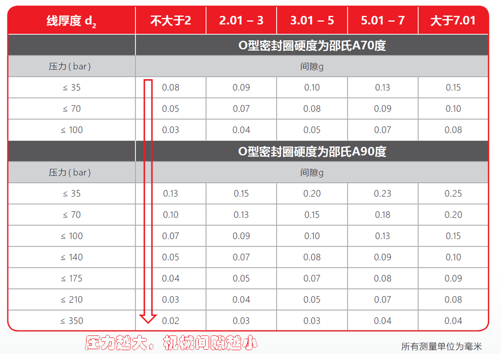 而機(jī)械間隙又取決于公差配合的選擇,加工工藝,裝配工藝等因素。除此之外,密封面間隙的壓力也是很關(guān)鍵的因素。下面給出O型圈線徑、所受壓力、機(jī)械間隙、硬度四者之間的關(guān)系表,可供設(shè)計時參考。粗略的看,總的設(shè)計原則就是——壓力越大,機(jī)械間隙就要越小。